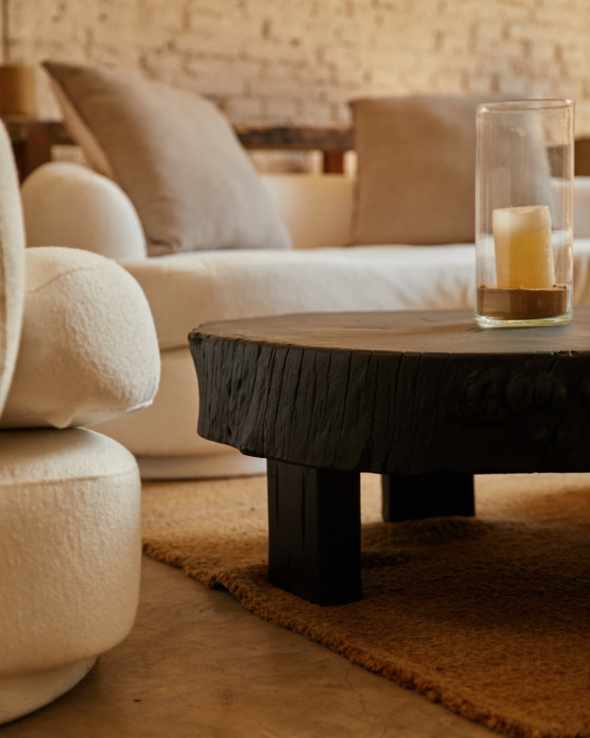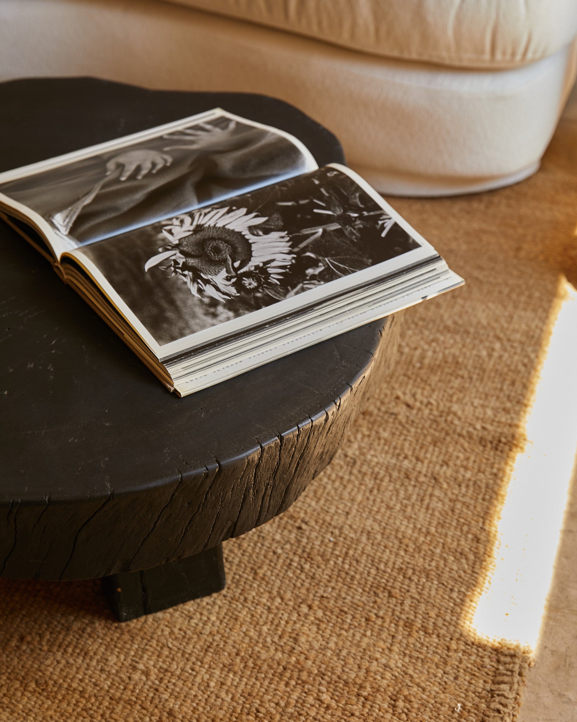 Mesa baja Rodaja Negra realizada con madera recuperada de árboles caídos.